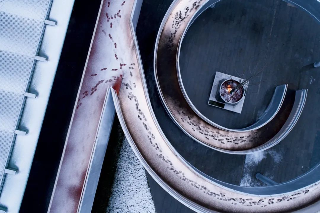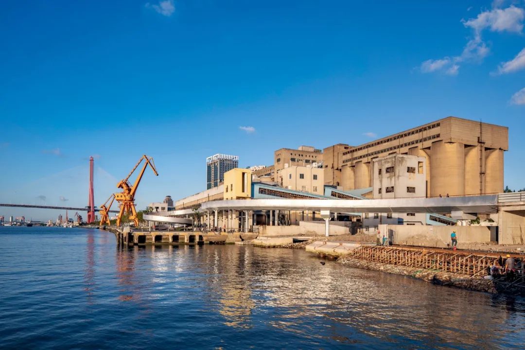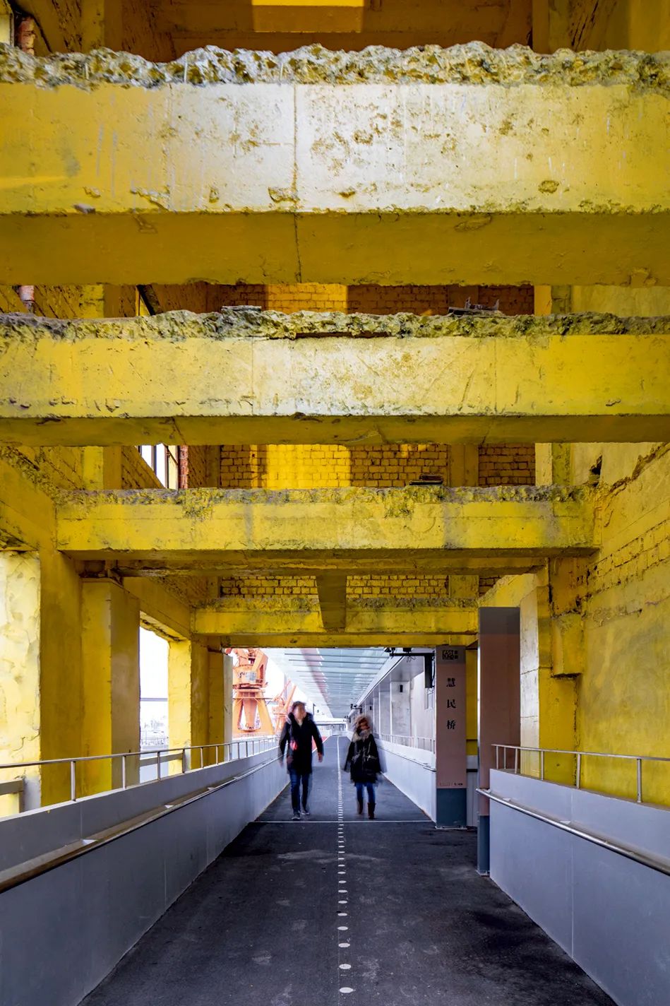 在这段高线坡道中还设计了2个螺旋坡道:一个是阶梯坡道,另一个是连续坡道,供人们自由选择上下于码头与高线之间。高线坡道选择了轻薄、优雅的钢斜撑结构,沿路保留了2座不再承载运输功能的转运站构筑物。对于整个项目而言,新老结构的保留与结合除了满足交通的功能,同时也是一种集体记忆的凝固和再现。高线结束于黄海标高11 m的轮渡站二层平台,形成完整的贯通工程。