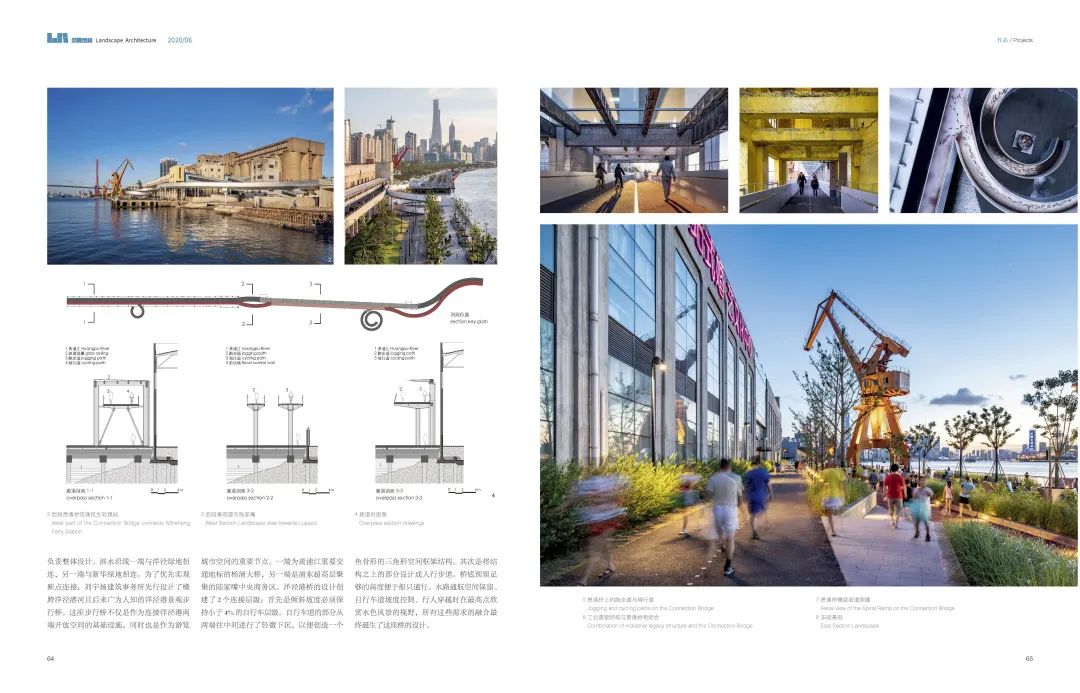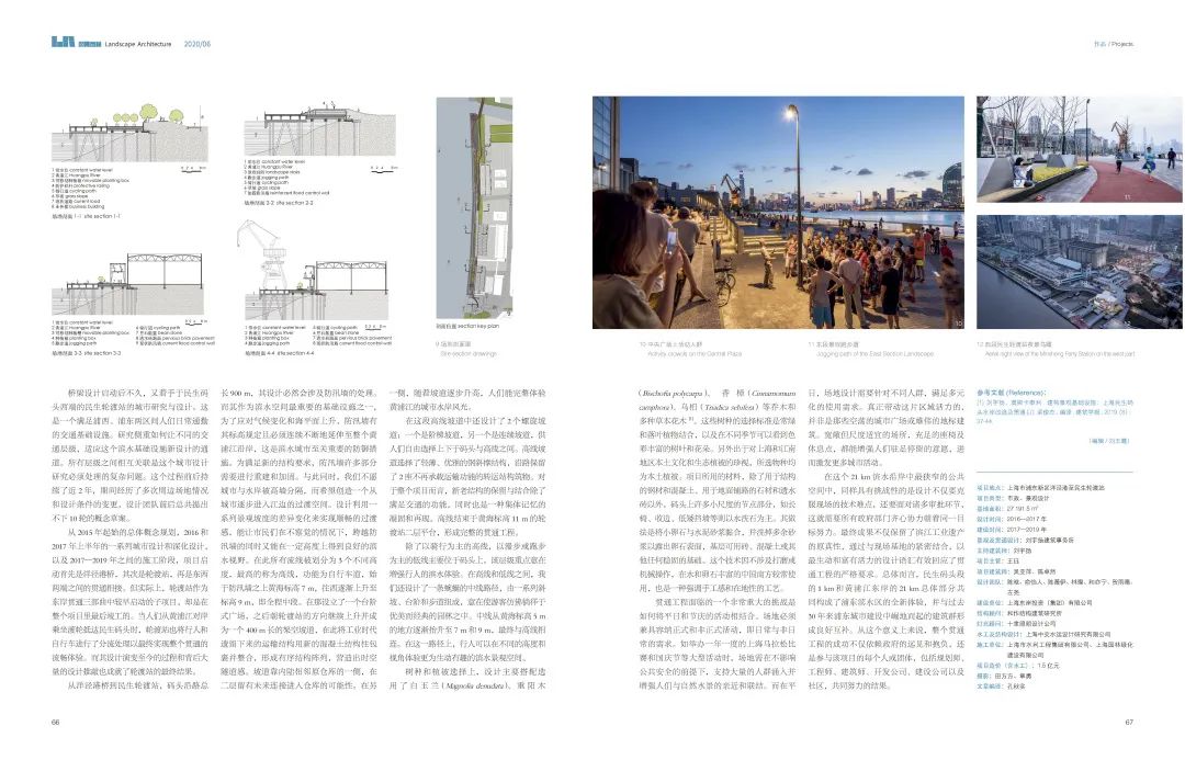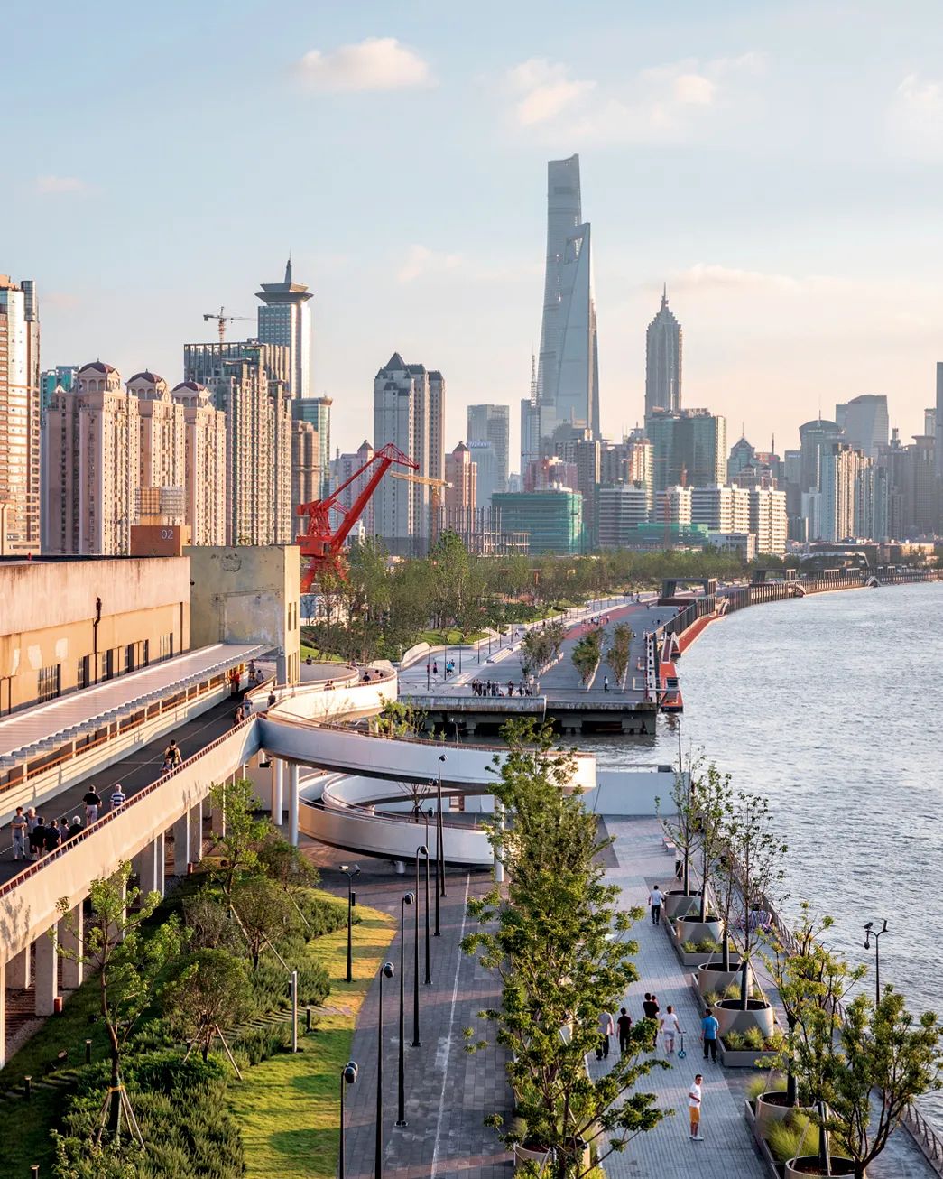 在这个21 km滨水沿岸中最狭窄的公共空间中,同样具有挑战性的是设计不仅要克服现场的技术难点,还要面对诸多审批环节,这就需要所有政府部门齐心协力朝着同一目标努力。最终成果不仅保留了滨江工业遗产的原真性,通过与现场基地的紧密结合,以最生动和富有活力的设计语汇有效回应了贯通工程的严格要求。总体而言,民生码头段的1 km和黄浦江东岸的21 km总体部分共同构成了浦东滨水区的全新体验,并与过去30年来浦东城市建设中崛地而起的建筑群形成良好互补。从这个意义上来说,整个贯通工程的成功不仅依赖政府的远见和抱负,还是参与该项目的每个人或团体,包括规划师、工程师、建筑师、开发公司、建设公司以及社区,共同努力的结果。