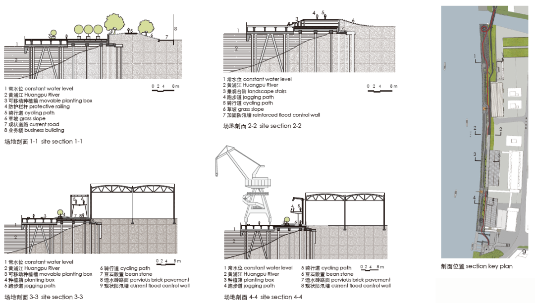 除了以骑行为主的高线,以漫步或跑步为主的低线主要位于码头上。该层级重点意在增强行人的滨水体验。在高线和低线之间,我们还设计了一条蜿蜒的中线路径,由一系列斜坡、台阶和步道组成,意在使游客仿佛徜徉于优美而经典的园林之中。中线从黄海标高5 m的地方逐渐抬升至7 m和9 m,最终与高线相连。在这一路径上,行人可以在不同的高度和视角体验更为生动有趣的滨水景观空间。