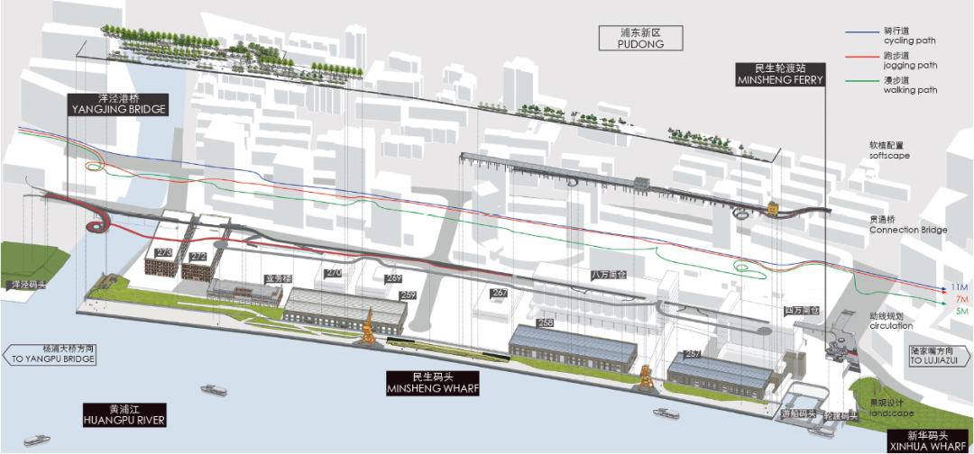 在总体概念规划工作结束时,为满足2017上海城市空间艺术季(SUSAS)的开展,东岸公司需要对民生码头部分仓库和公共空间进行翻新。这段全长近1 km的滨水区,由刘宇扬建筑事务所及上海中交水运设计研究有限公司负责整体设计。滨水沿线一端与洋泾绿地相连,另一端与新华绿地相连。为了优先实现断点连接,刘宇扬建筑事务所先行设计了横跨洋泾港河且后来广为人知的洋泾港景观步行桥。这座步行桥不仅是作为连接洋泾港两端开放空间的基础设施,同时也是作为游览城市空间的重要节点。一端为黄浦江重要交通地标的杨浦大桥,另一端是浦东超高层聚集的陆家嘴中央商务区。洋泾港桥的设计创建了2个连接层级:首先是倾斜坡度必须保持小于4%的自行车层级。自行车道的部分从两端往中间进行了轻微下沉,以便创造一个鱼骨形的三角形空间框架结构。其次是将结构之上的部分设计成人行步道。桥底预留足够的高度便于船只通行。水路通航空间保留、自行车道坡度控制、行人穿越时在最高点欣赏水色风景的视野,所有这些需求的融合最终诞生了这座桥的设计。