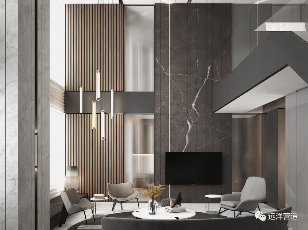 同时,我们也将一些传统的文化意象和建筑情绪都尽可能的表达在项目的精装当中。尤其在灯光的设计上我们进行了大量的延展,我们会思考关于光线与人、环境的关系。抓住这些点,我们进行了材质的结合和光线的运用。这样光线的思考与研究不仅是为了给住户营造一个温暖舒适的居住环境,也传承了武汉东方历史文化的悠久。我们把特殊的文化元素与抽象中式精神作为建筑内核,用当代的艺术形式和生活方式为引导进行精装,实现历史和未来融合的生活愿景。