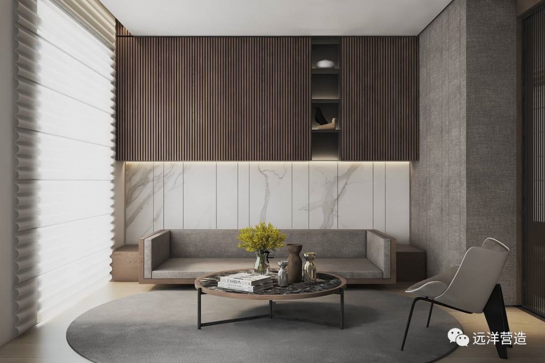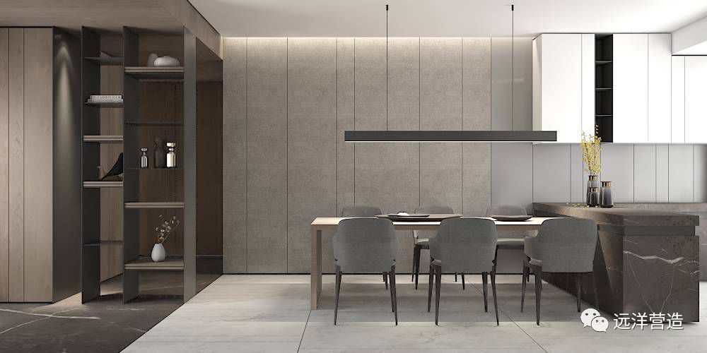 机能住宅的命题就是在加法基础上再去做减法,减法即合理优化。与市面上简单的“装饰+舒适配置”不同,远洋的产品是“美学+机能+舒适设备”。比如说,在墙体上,摒弃传统砌筑墙体做法,市面上大户型的电视背景墙就是墙板硬包,仿石的大板砖,纯装饰,没有任何的功能提升,无法满足后期储物需求。而我们的做法是采用入墙式的柜体装饰柜,将电视背景墙做成了壁龛、开放柜、配灯带……精挑细选多种材料优化组合,既满足观影需求,又增添收纳空间。对于小户型的电视背景墙我们也同样进行了充分考虑。