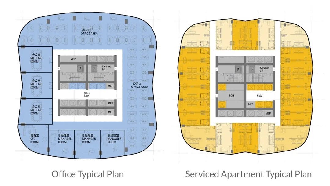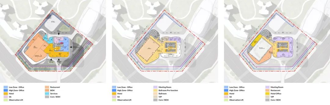 办公区域设于较低楼层以便来往通勤。酒店则位于大楼中部,并在塔楼首三层另设有活动功能区,与其西侧裙楼部分实现无缝连接。酒店配有餐厅、挑空的宴会厅以及位于四层楼顶花园,可供所有人使用。位于高层的酒店式公寓可尽览祥和海景;楼顶处设有观景平台,包括一个露天泳池和高端的会所设施。
