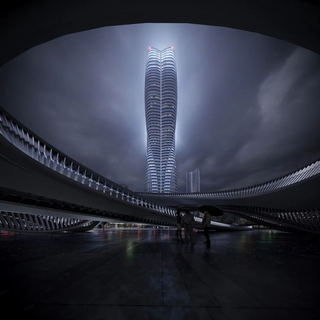此设计方案包含一座集办公、酒店和酒店式公寓于一体的超高塔楼,底部为四层裙楼。由于当地有舞龙传统,用于为大地祈雨和降福,受此启发,大楼设计采用螺旋上升式造型,宛若一条蛟龙飞升出海面,直冲云霄。