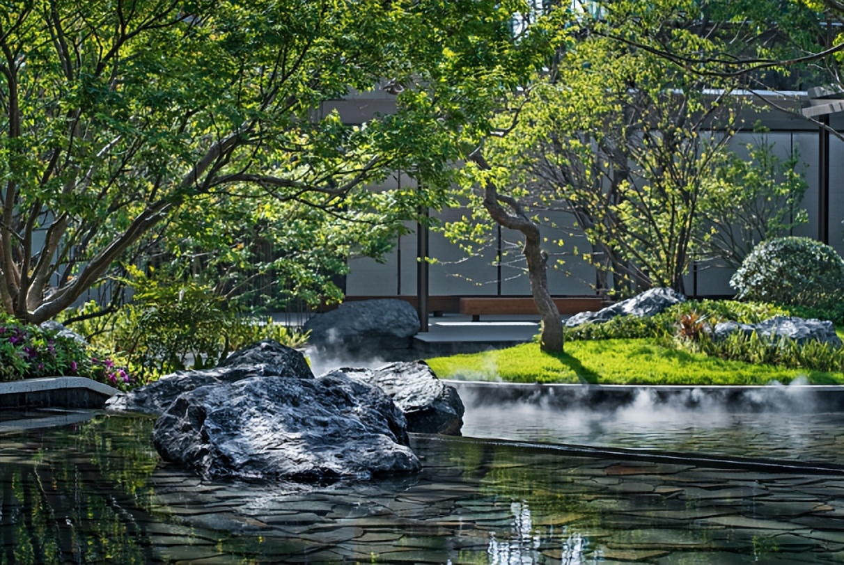 步入院内,在园林景观的打造上,东原以半亩方塘的方式致敬城市传统记忆和文化,呈现出山石画境、曲水流觞、四季迎春、有树入廊、泗水归源、水木相依的六境,体现的是对东方品位的向往。